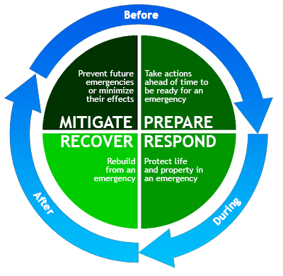 The number of large-scale disasters, particularly related to wildfires, have raised awareness of the needs of animals in disasters and planning for meeting those needs. A comprehensive emergency management strategy could mitigate commonly occurring issues affecting animals in disasters. This strategy includes application of the principles of emergency management to the care of animals in disasters, which leads to improvements of public and animal welfare that are sustainable and will likely reduce the incidence of animal issues arising in disasters. Emergency managers recognize four phases of the emergency management lifecycle: Mitigation, Planning/Preparedness, Response, Recovery.