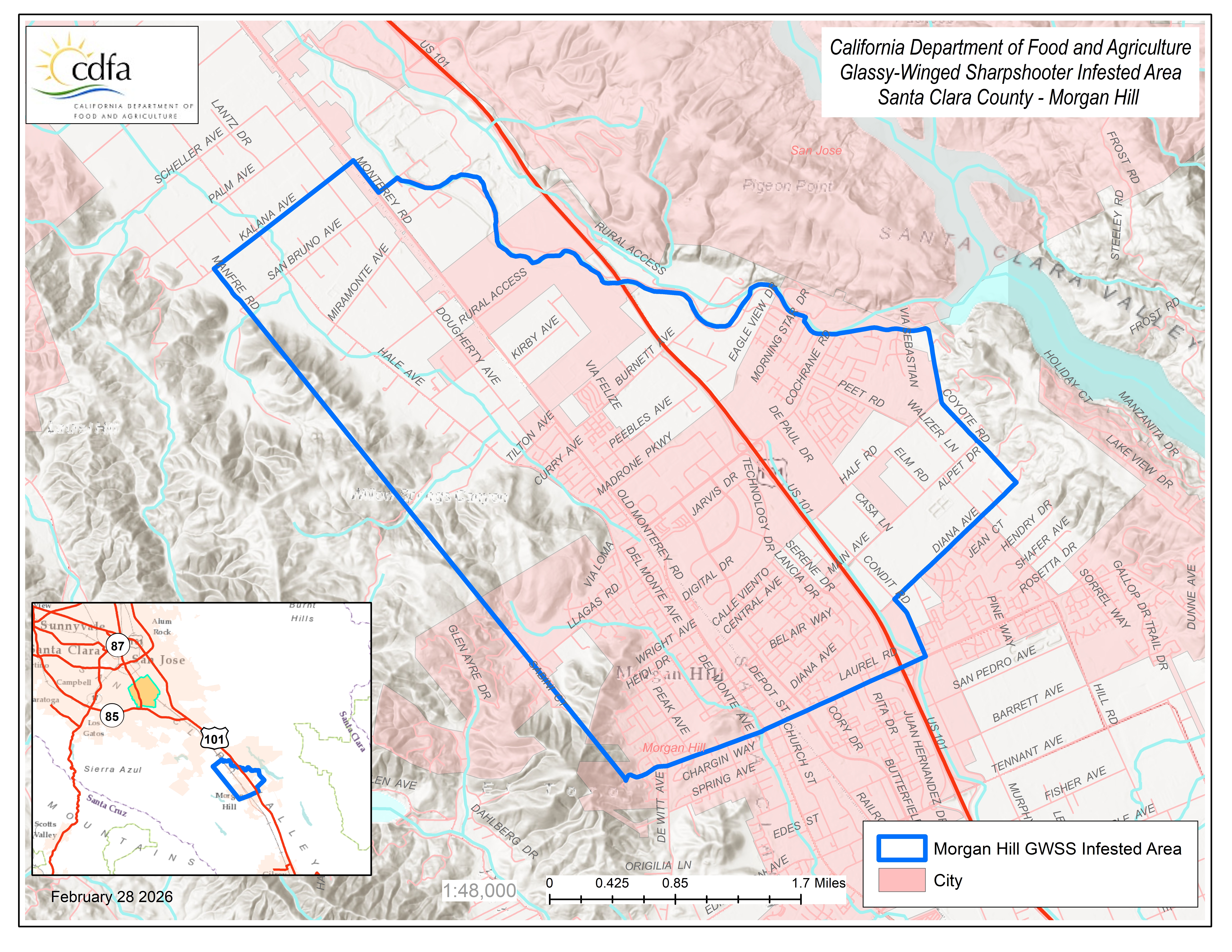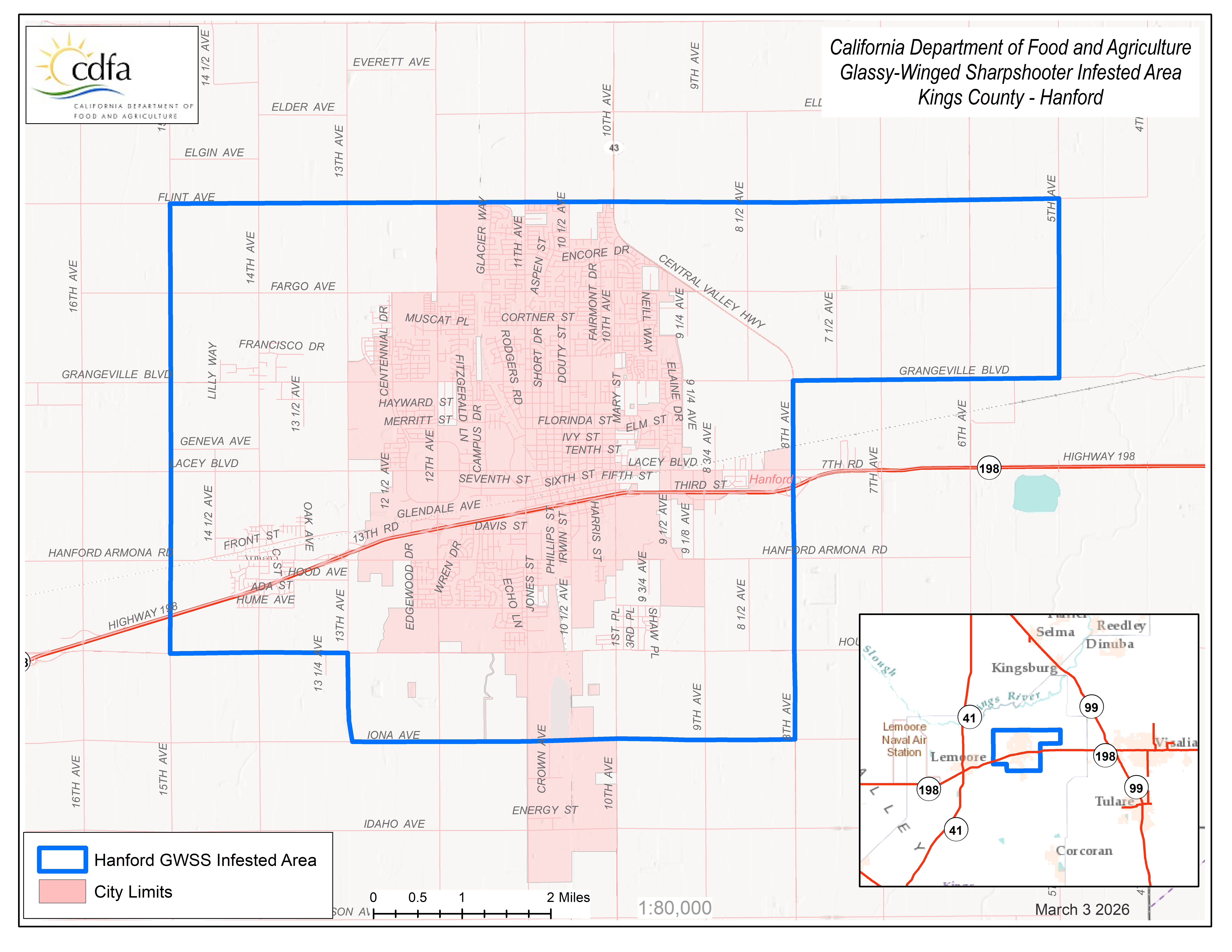 These are areas subject to program regulations because of the presence of the glassy-winged sharpshooter. There are overviews of current and eradicated infested areas throughout the state, and maps that are designed to clearly show the boundaries of the infested areas for the partially infested counties.